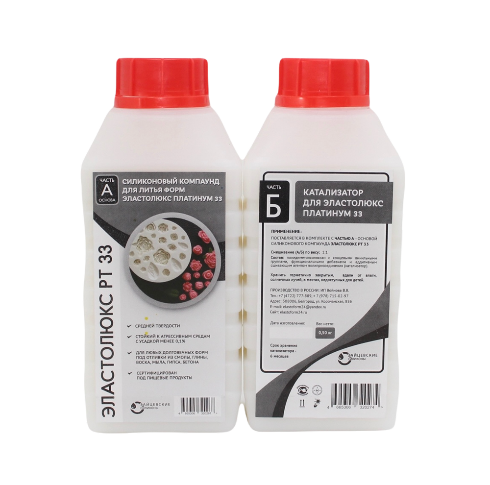 Платиновый силикон Эластолюкс Платинум 33 ― безусадочный, стойкий и нетоксичный силикон для форм с повышенной твердостью. Является пищевым силиконом. При работе с пластиками нужна разделительная смазка. Данный платиновый силикон идеален для пищевых продуктов. Выходят все пузыри даже без использования вакуумной камеры. Силикон на платиновом катализаторе применяется там, где важны отсутствие запаха (для пищевых продуктов), безусадочность (при изготовлении больших изделий), стойкость к агрессивным средам (для полиуретанов, пластиков, для щелочей, полиэфирных, эпоксидных и других смол). Платиновый силикон Эластолюкс Платинум предназначен для  изготовления любых сложных высокоэластичных долговечных форм:  для искусственных камней, мыла, свечей, смол, гипса, парафинов, полимерной глины и пищевых продуктов, мастики и вайнеров.  Платиновый силикон подходит также для форм под шарнирные куклы, для производства вайнеров (штамповка глины, керамическая флористика и т.д.).